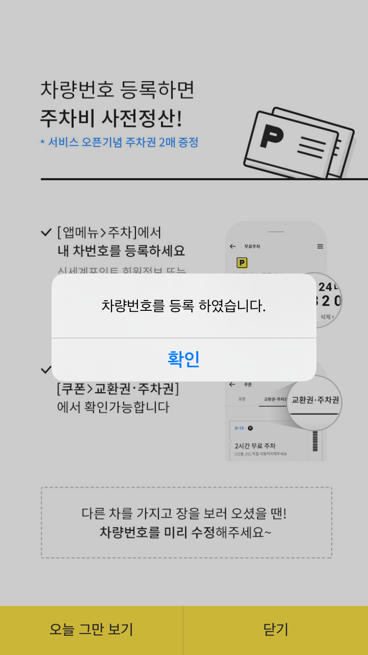 3. 차량번호 등록 완료 시, 쿠폰발급 안내 메세지 발생