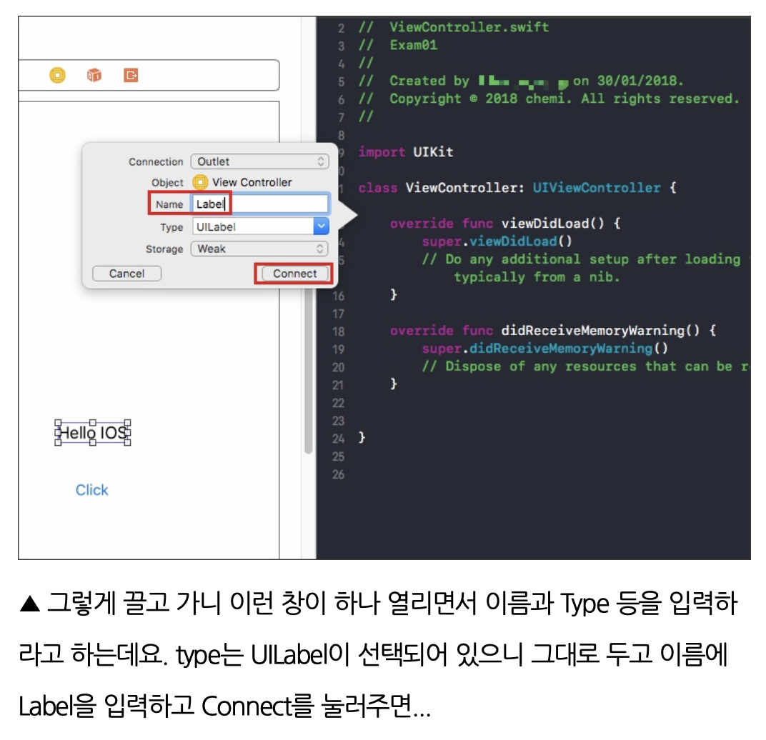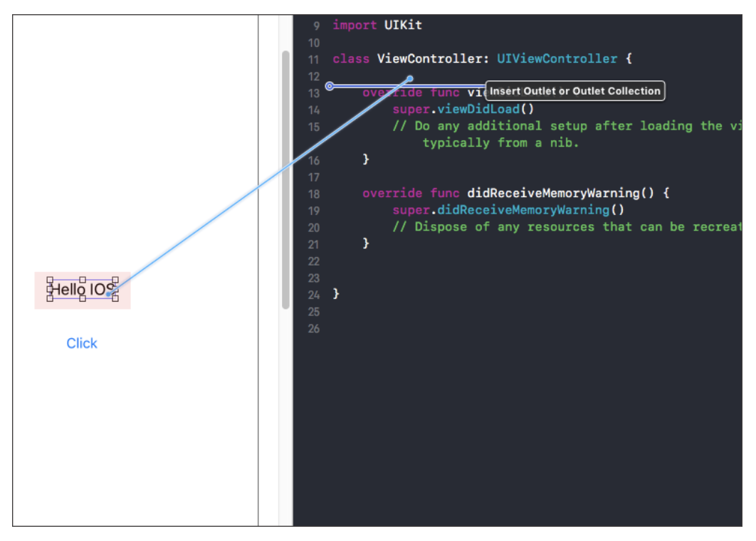 아래 그림처럼 왼쪽 버튼을 선택 후, Control키를 누른 상태에서 오른쪽 Swift 코드 영역으로 끌어다 놓고