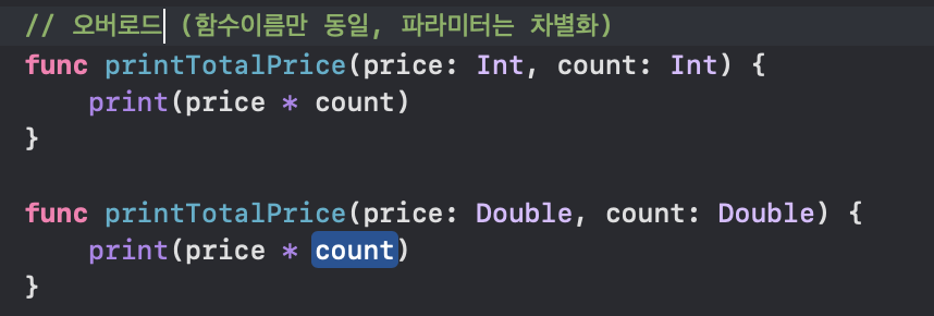 * 오버로드 : 함수의 이름은 같지만, 파라미터의 개수나 타입을 다르게 사용하는 경우