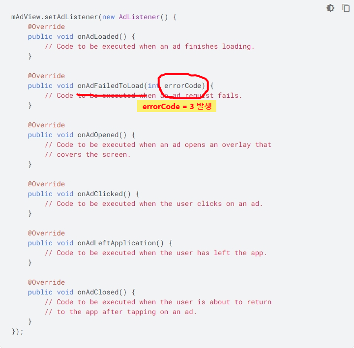 애드몹 광고 이벤트 리스너를 이용해서 오류코드 값을 확인해보았다.