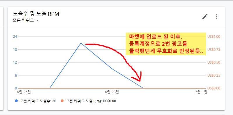 6월 말에 앱을 마켓에 등록하고 테스트폰, 내 실제 사용기기에 앱을 다운로드하고 테스트했을 당시에는 광고수익 그래프가 올라갔었다. 하지만, 구글 자체적인 검증과정에서 무효화 패턴에 걸려서 수익이 0$로 원상복귀 ㅠ.ㅠ (역시 구글이구나..)