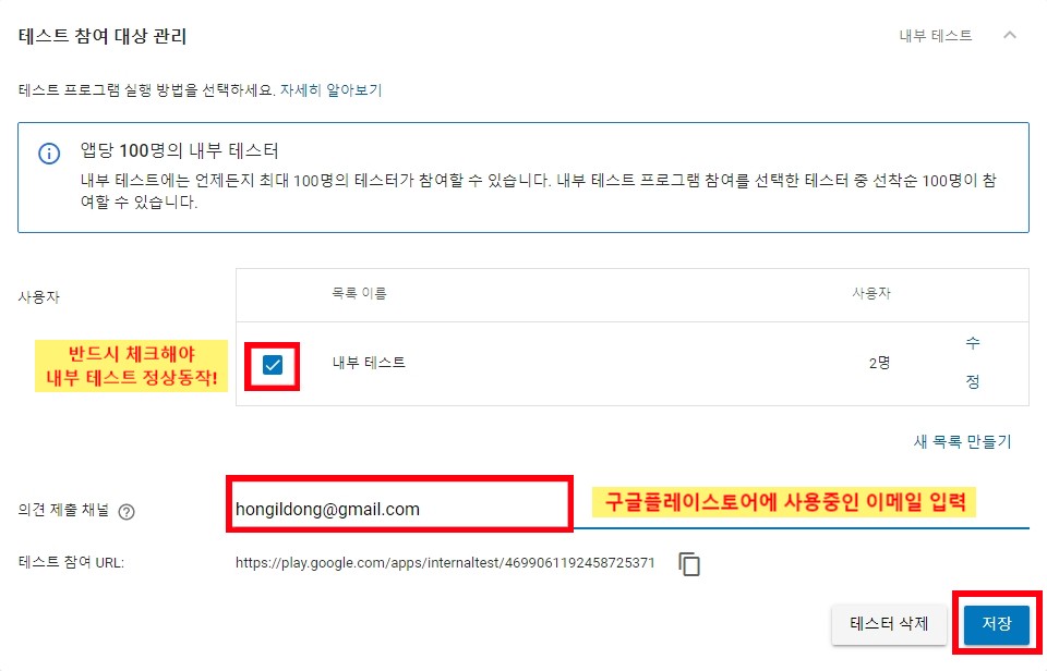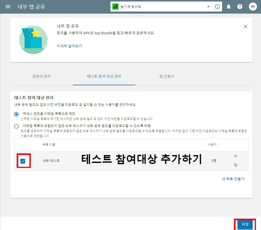 2. 내부 앱 공유 페이지 내 '테스트 참여 대상 관리' 탭을 선택하여, 테스트 참여 대상을 추가한다.