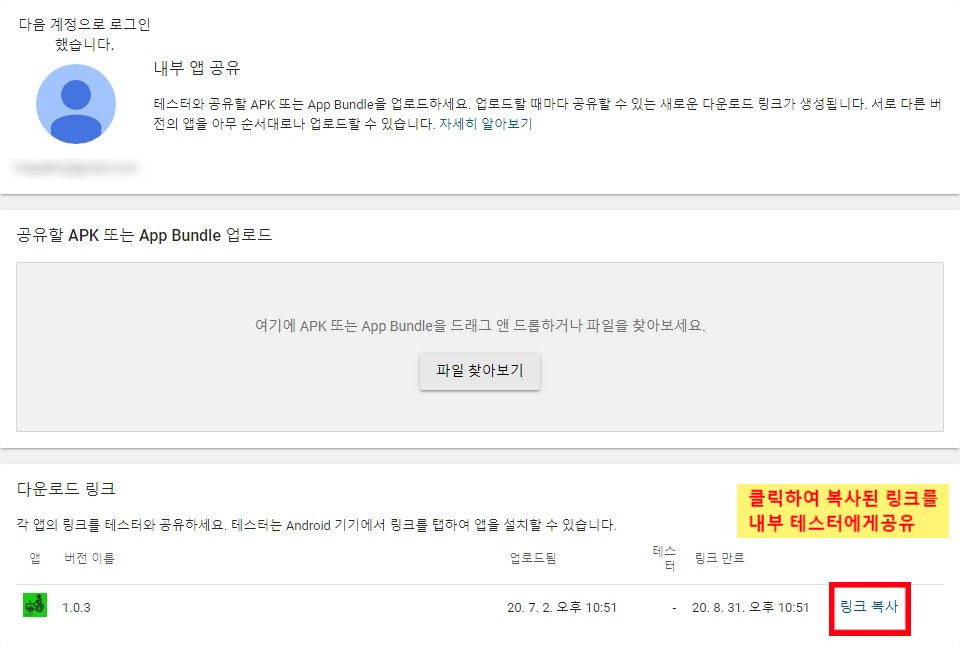 5. AAB/APK 정상 업로드 이후, 생성된 다운로드 [링크 복사] 하여 내부 사용자에게 공유하기