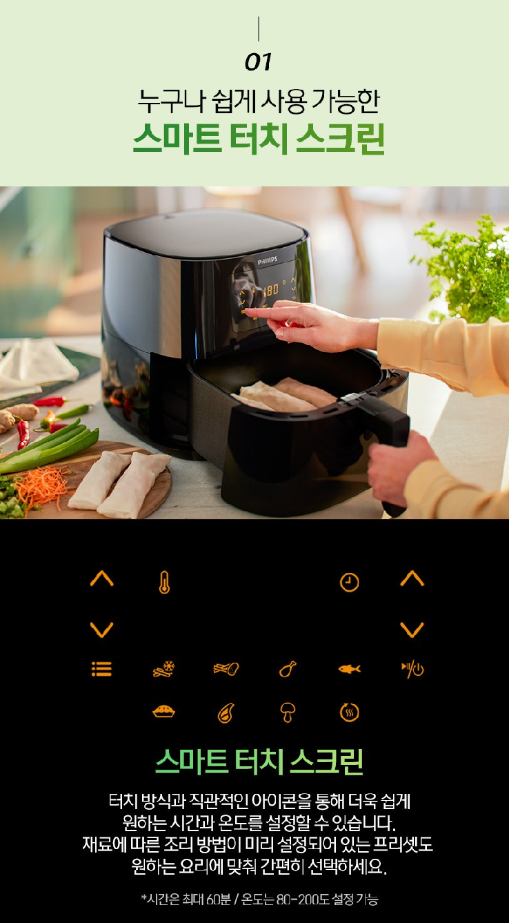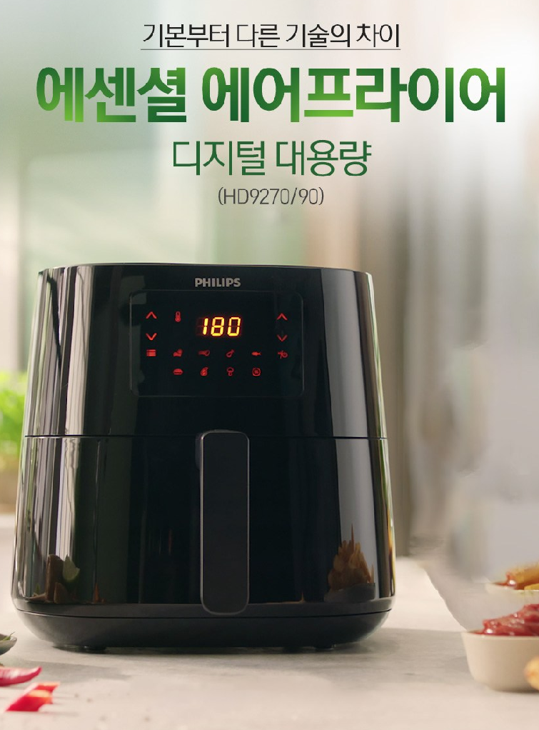 게다가 기존의 아날로그 방식의 에어프라이어는 미세한 분조절을 하기 어려웠지만, 필립스 9270 모델은 '터치 스크린' 방식으로 1분 단위로 미세한 조리시간 조절이 가능합니다.